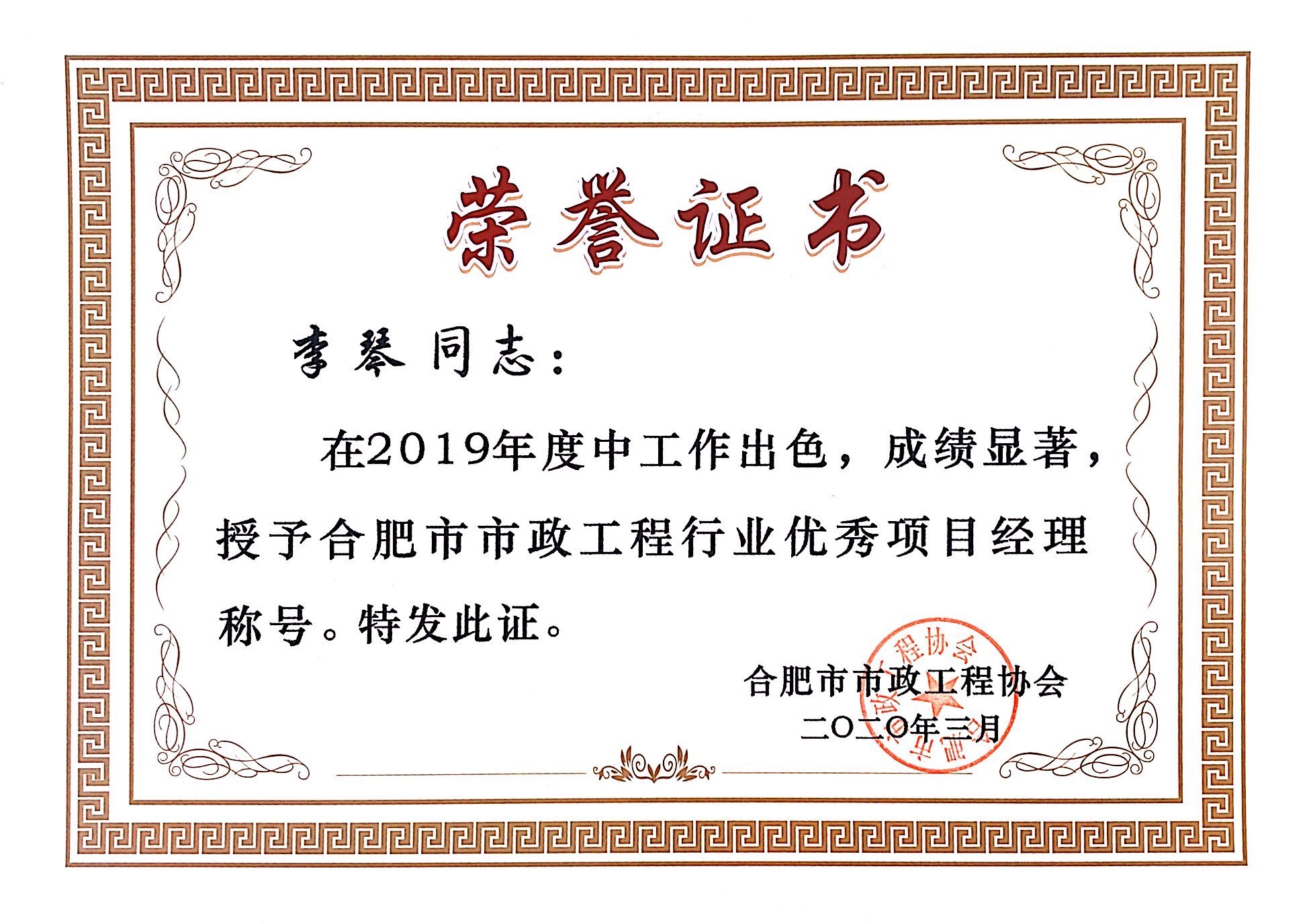 >李琴2019市政优秀项目经理