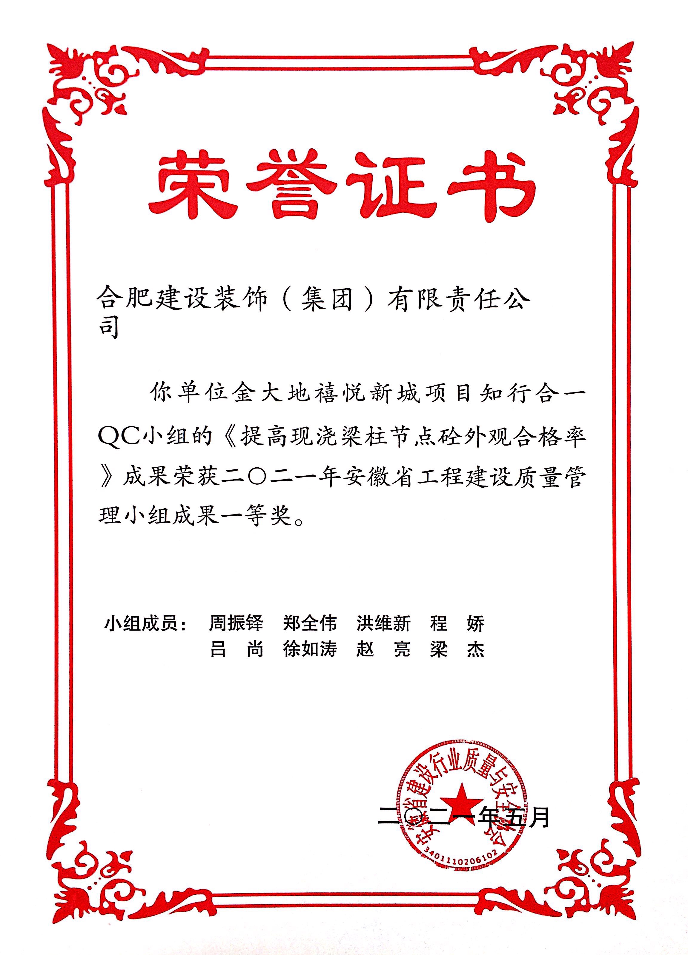 金大地禧悦新城QC小组 提高地下室混凝土外墙刚性防水一次验收合格率 2021年安徽省工程建设质量管理二等奖